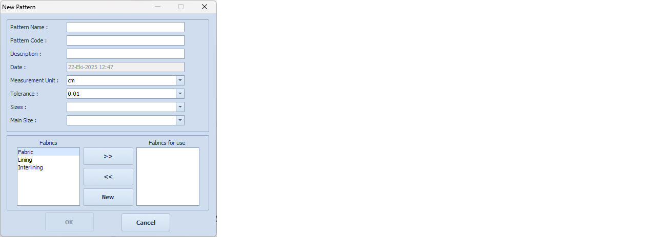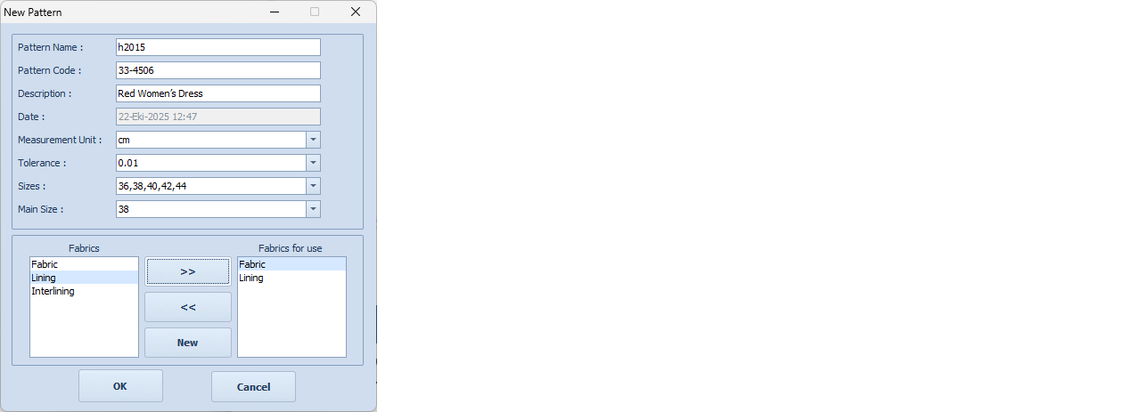 Fabrics: From the list, select the fabrics applicable to the model and move them to the “Fabrics to be Used” section using the right arrow. If you need to add a fabric group not in the list, click the “New” button and enter the fabric name in the table that appears (e.g., Fabric and Lining).