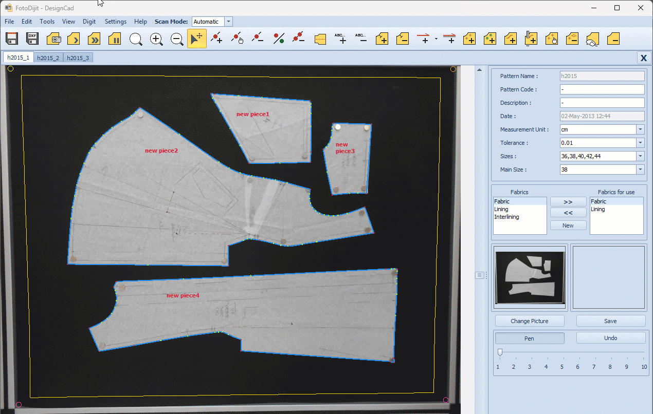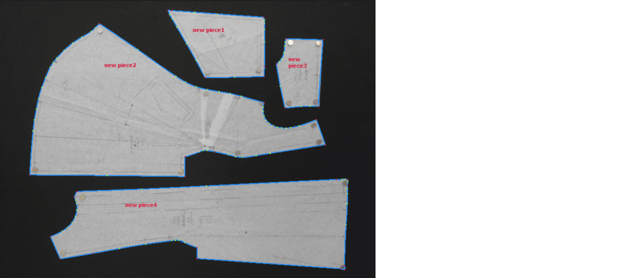 - The scanned pattern is filled with a blue color and automatically assigned a piece name at the end of the process (e.g., new piece 1, new piece 2, etc.).