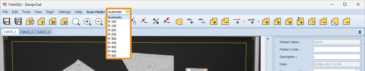 If the scan cannot be completed due to insufficient lighting or the color of the pattern, stop the scanning process. Then, open the menu next to the Scan Mode section in the top menu and adjust the scanning sensitivity. After changing the sensitivity level, continue the scanning process.