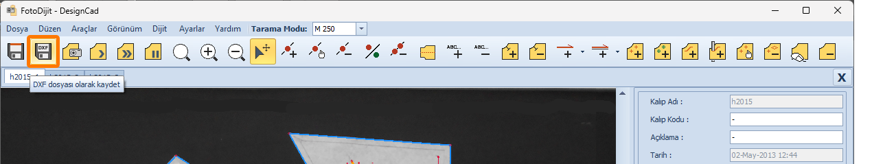 1.) Kalıp dijitleme işlemi tamamlandıktan sonra üst menüden DXF Dosyası Olarak Kaydet