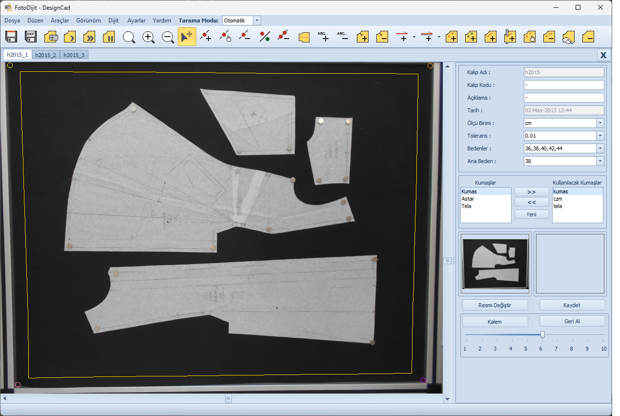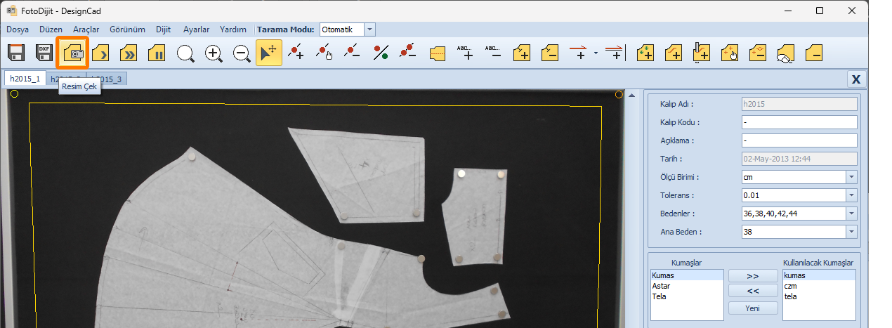 Resim çekme işlemi öncesinde dijitlenecek kalıplar masa kenarından yaklaşık 5 cm kadar boşluk ve her kalıp arası en az 3 cm olacak şekilde masaya yerleştirilir. Fotoğraf makinası kapalı ise on/off düğmesi vasıtasıyla makina üzerinden açılır.