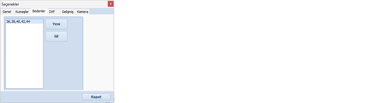sekmesinden yeni bir beden eklenebilir ve