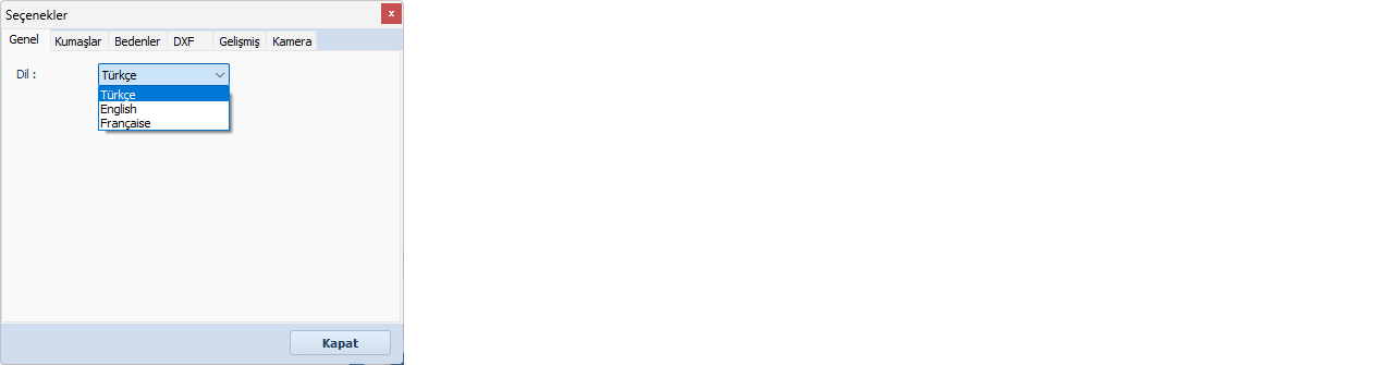 Açılan pencerede ilk sekme Genel sekmesidir. Bu sekme üzerinden program dili seçilebilir. (Türkçe, İngilizce veya Fransızca)