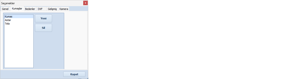 butonu tıklanarak açılan pencereden yeni bir kumaş eklenebilir. Eklenen kumaşlar arasından seçim yapılarak,