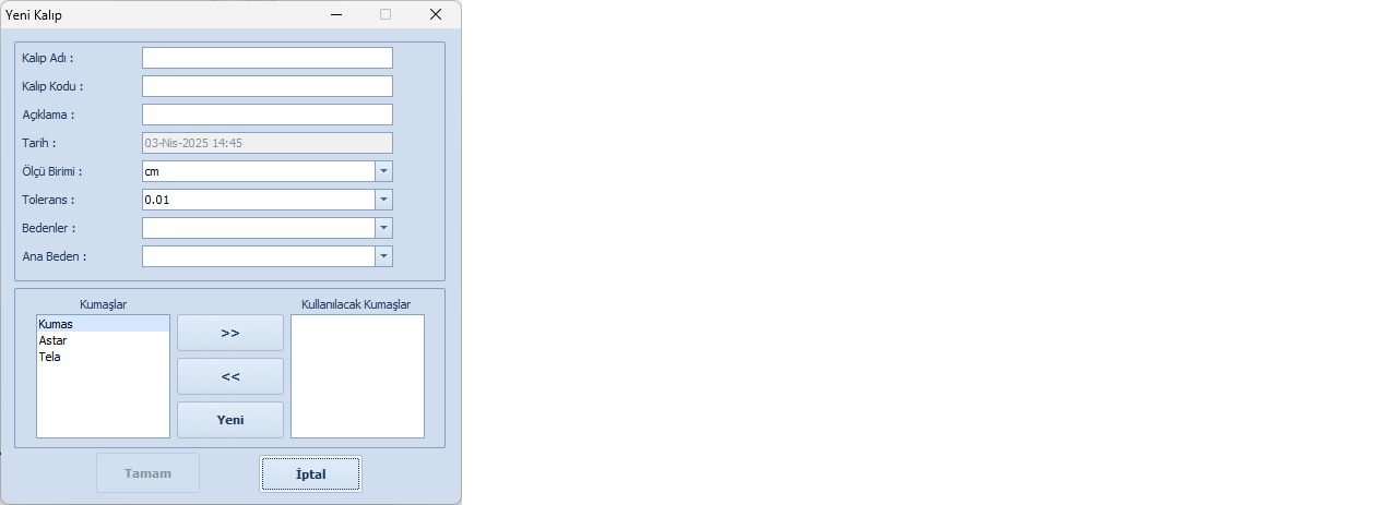 - Kumaşlar: Listeden modele ait kumaşlar seçilerek yan ok tuşu ile kullanılacak kumaşlar bölümüne atılır. Listede olmayan bir kumaş gurubu eklenecek ise yeni tuşuna basılarak gelen tabloya kumaş ismi girilir.